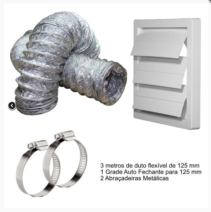 3 metros de duto flexível de 125mm: O tubo flexível que acompanha este kit, possui três metros de comprimento e é feito com fitas duplas de aluminio, deixando o tubo extremamente forte contra cortes indesejáveis.